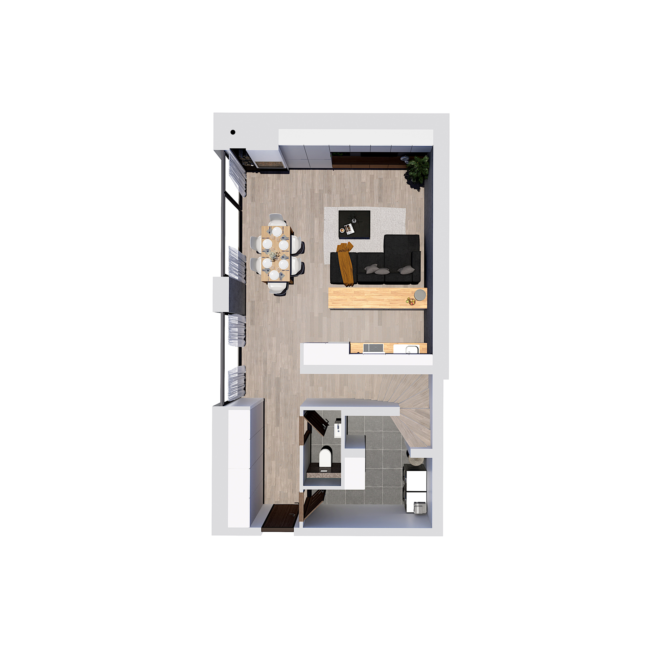 V 1.NP se Vám otevírá obývací prostor s kuchyňským koutem, který navazuje na soukromou zahradu s terasou a tím rozšiřuje životní prostor. Plně vybavená moderní kuchyňská linka je nedílnou součástí otevřeného prostoru a velkoplošná okna zajišťují prosvětlenost celého interiéru. Nechybí zde dlouhá vstupní chodba, toaleta a praktická technická místnost.