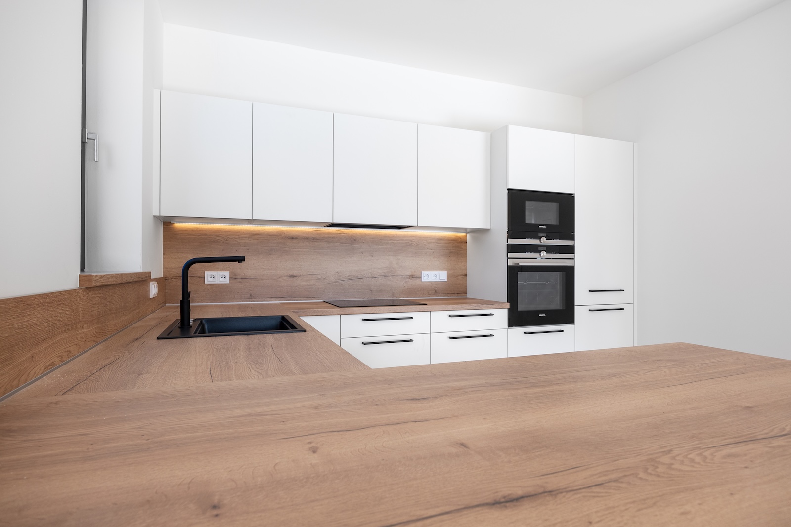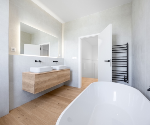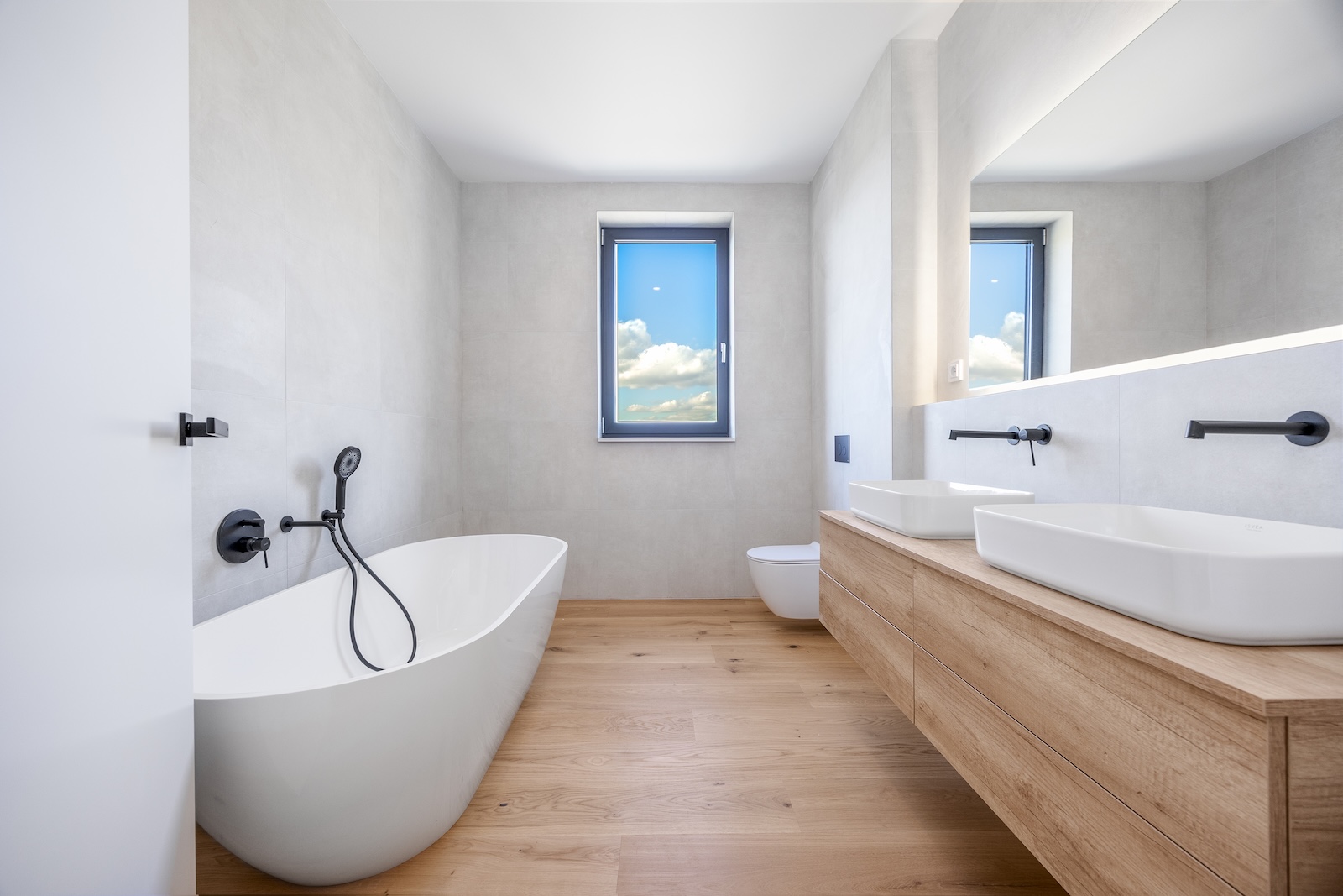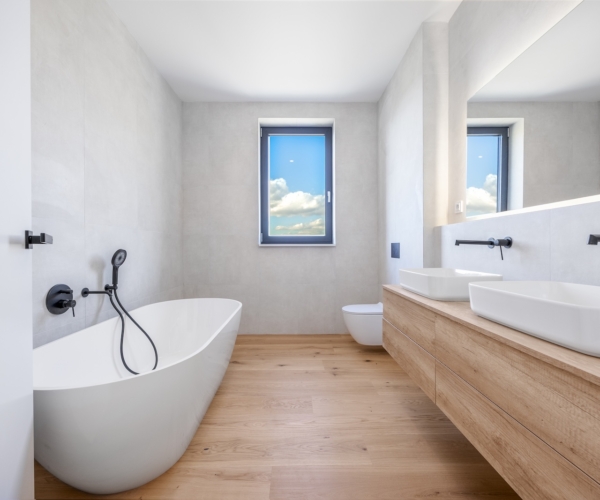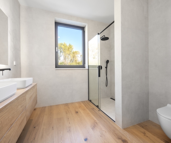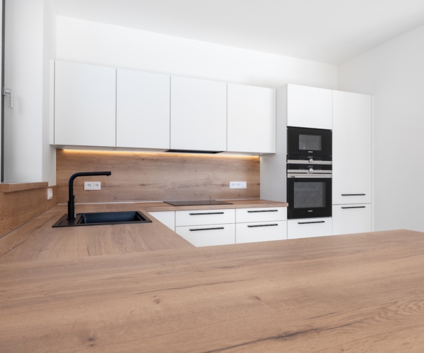 Samozřejmostí je automatická zahradní závlaha, venkovní žaluzie, velkoformátová okna, designová svítidla, plně vybavený kuchyňský kout (vestavěné spotřebiče Siemens) i koupelny (matně černé baterie a topné žebříky, dřevěný nábytek na míru, zrcadla s LED podsvícením).