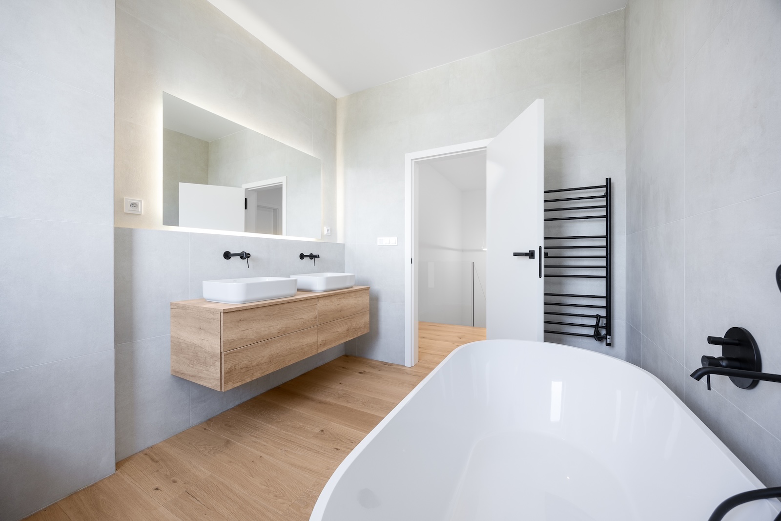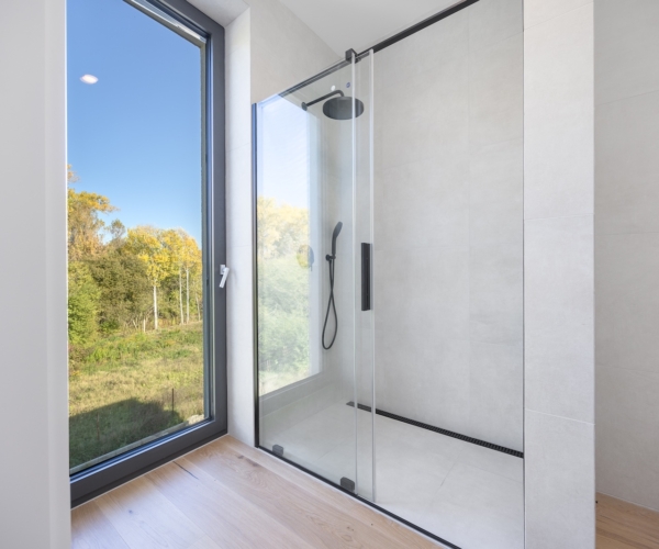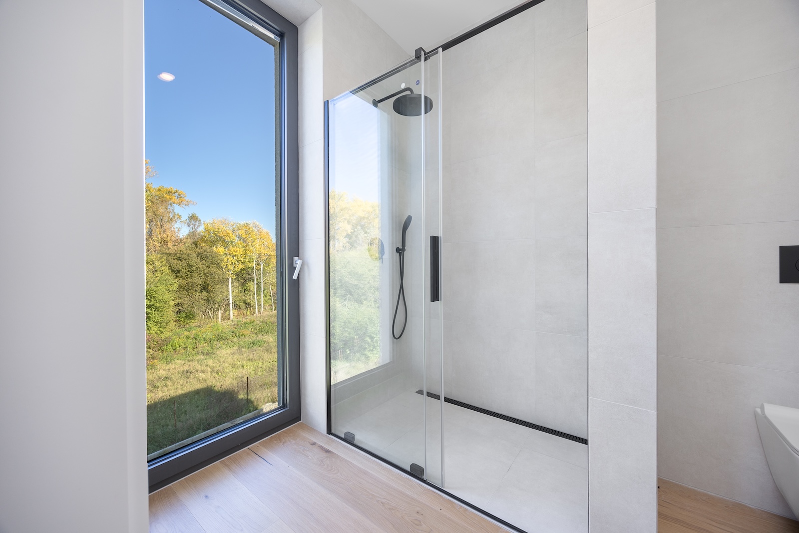 Samozřejmostí je automatická zahradní závlaha, venkovní žaluzie, velkoformátová okna, designová svítidla, plně vybavený kuchyňský kout (vestavěné spotřebiče Siemens) i koupelny (matně černé baterie a topné žebříky, dřevěný nábytek na míru, zrcadla s LED podsvícením).