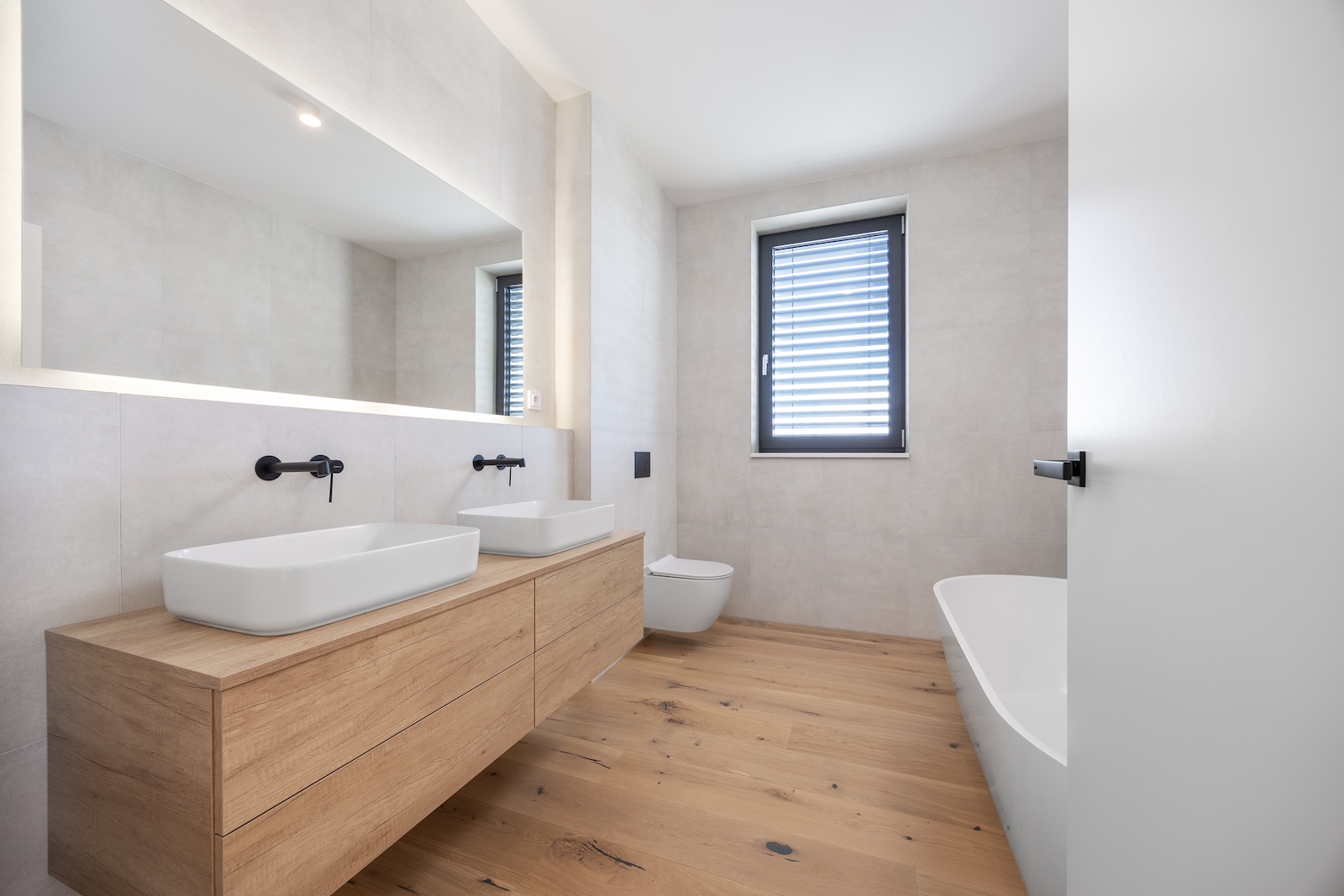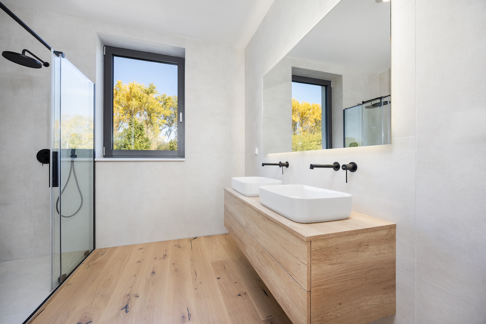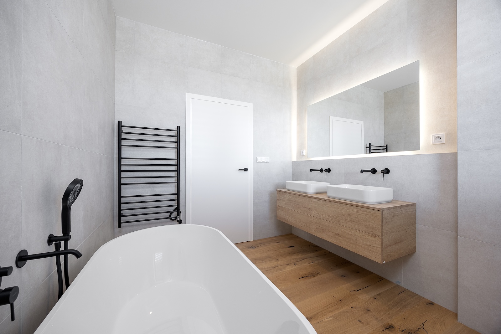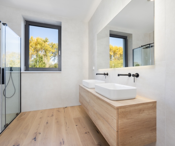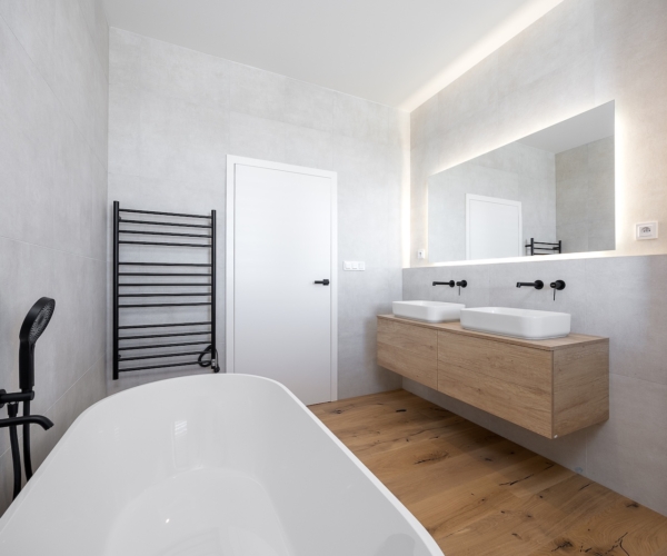 Samozřejmostí je automatická zahradní závlaha, venkovní žaluzie, velkoformátová hliníková okna, designová svítidla, plně vybavený kuchyňský kout (vestavěné spotřebiče Siemens) i koupelny (matně černé baterie a topné žebříky, dřevěný nábytek na míru, zrcadla s LED podsvícením).